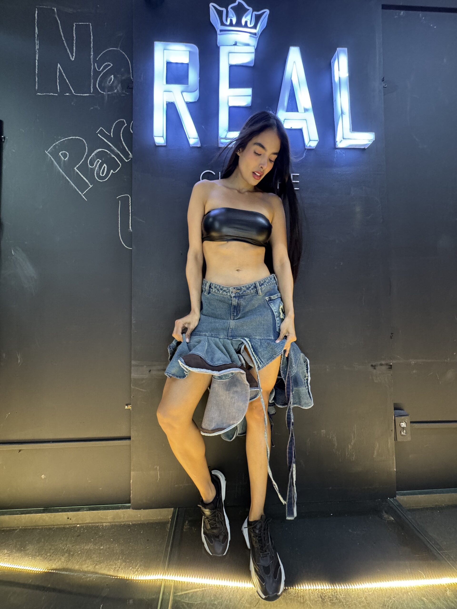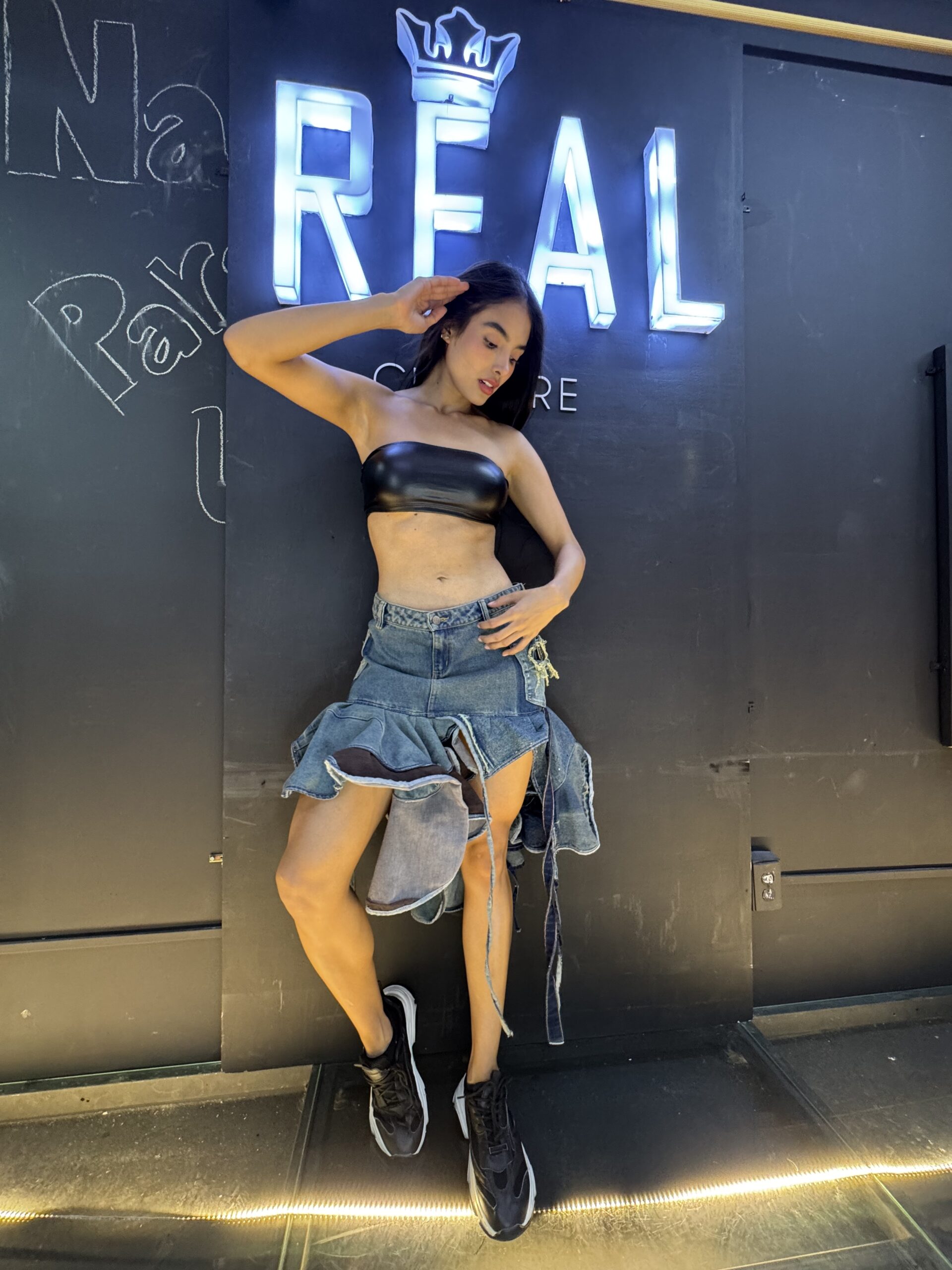 Mini falda de denim deconstructed con volantes, bolsillos expuestos y acabado raw. Energia urbana.