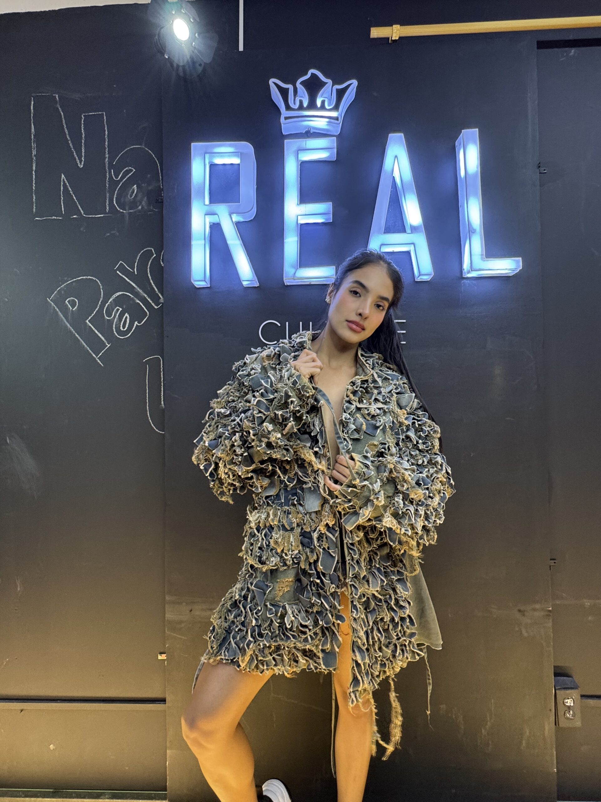 Abrigo oversize de denim deconstructed con textura 3D de flecos artesanales. Pieza statement de edicion limitada.